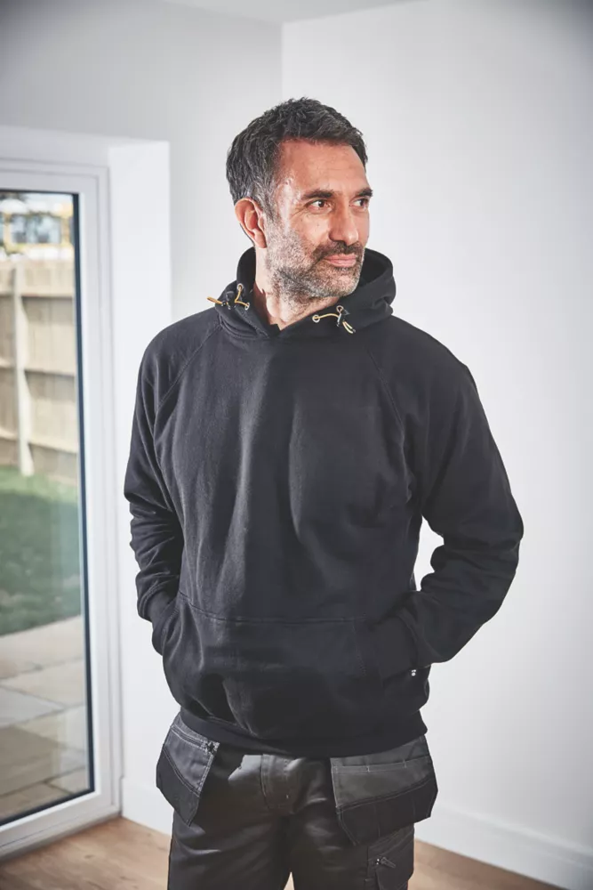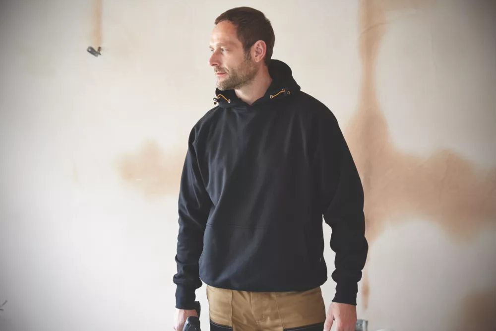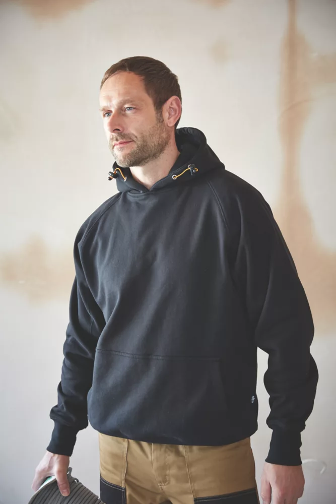 Heavyweight hooded sweatshirt with ribbed hem and cuffs for warmth. Kangaroo pouch front pocket. 320g/m².