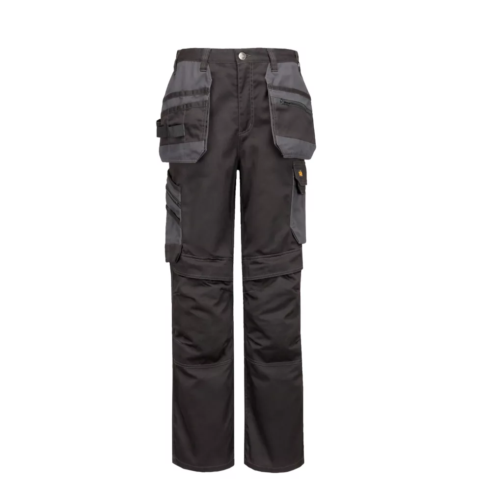 Relaxed fit work trousers with top-loading knee pad pockets. Made with recycled polyester and constructed with double stitching for durability. Features free swing pockets to give comfort whilst moving. Includes hammer strap, zipped pockets for valuables and mobile phone pocket.