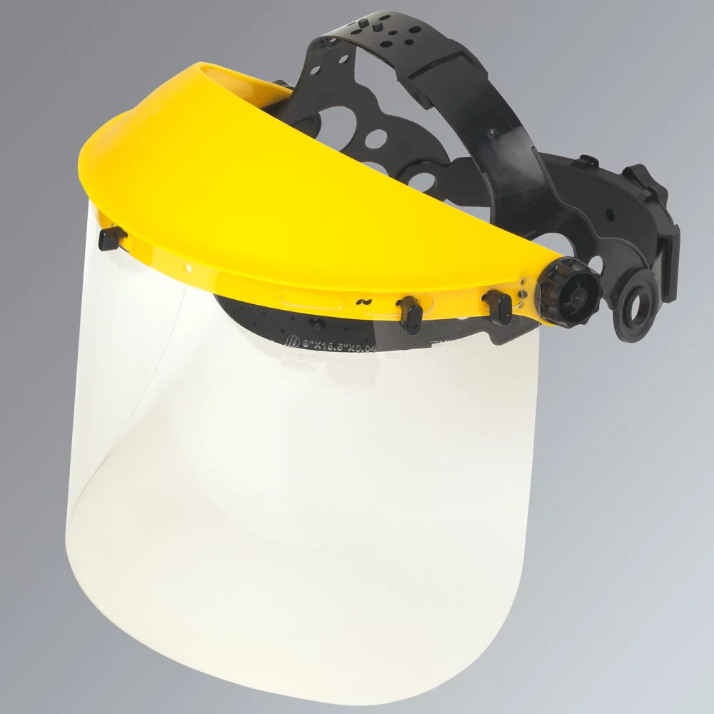 Lightweight, flip-up polycarbonate visor with adjustable head harness. Protects against liquid droplets and splashes (Grade 3). Protects against impact up to 120m/s (Grade B).