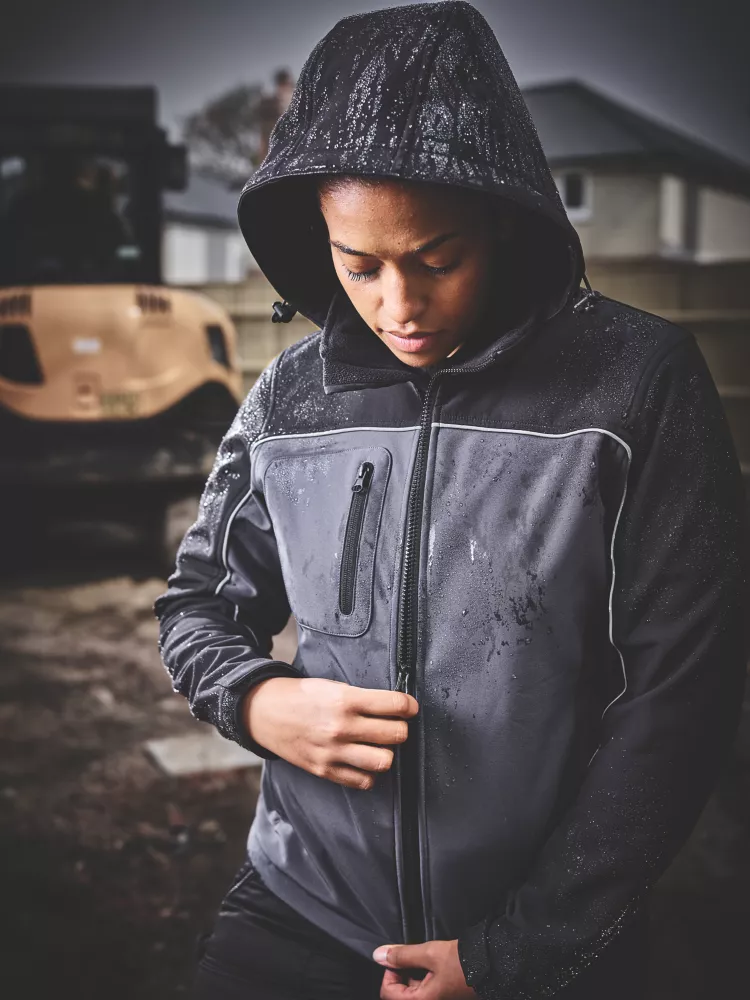 Water-resistant softshell jacket with microfleece lining, adjustable cuffs and detachable hood. 310g/m².