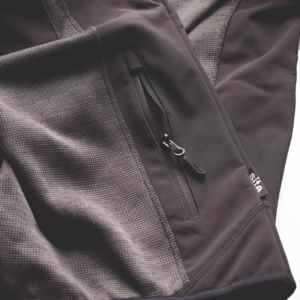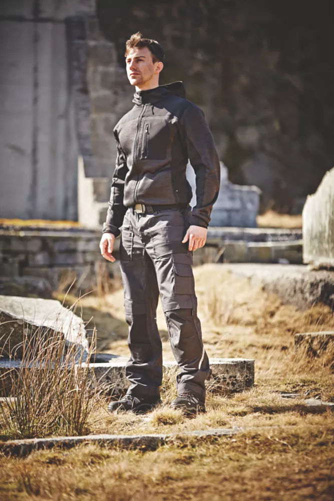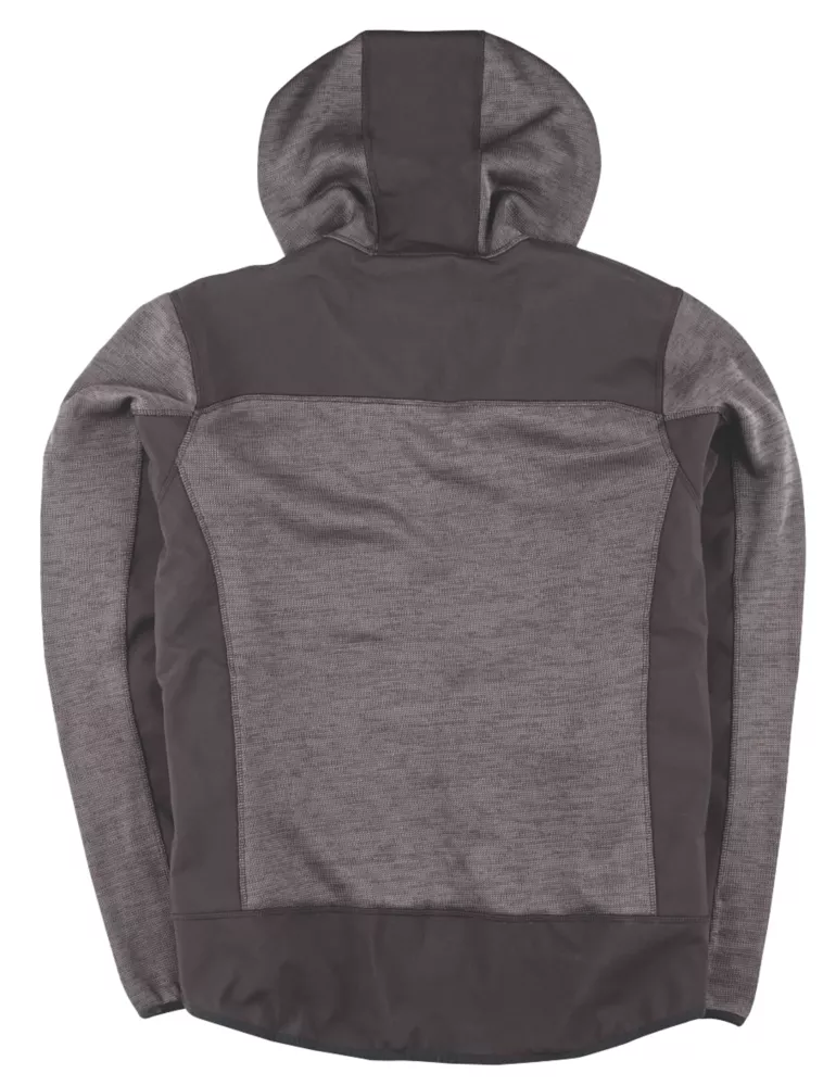 Lightweight, knitted hoodie with fleece lining and abrasion-resistant softshell panels. 380g/m².