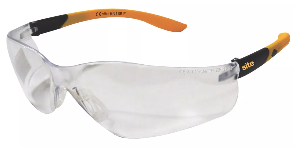 Comfortable, frameless wraparound safety specs. Moulded rubber nosepiece and soft temples for comfort.