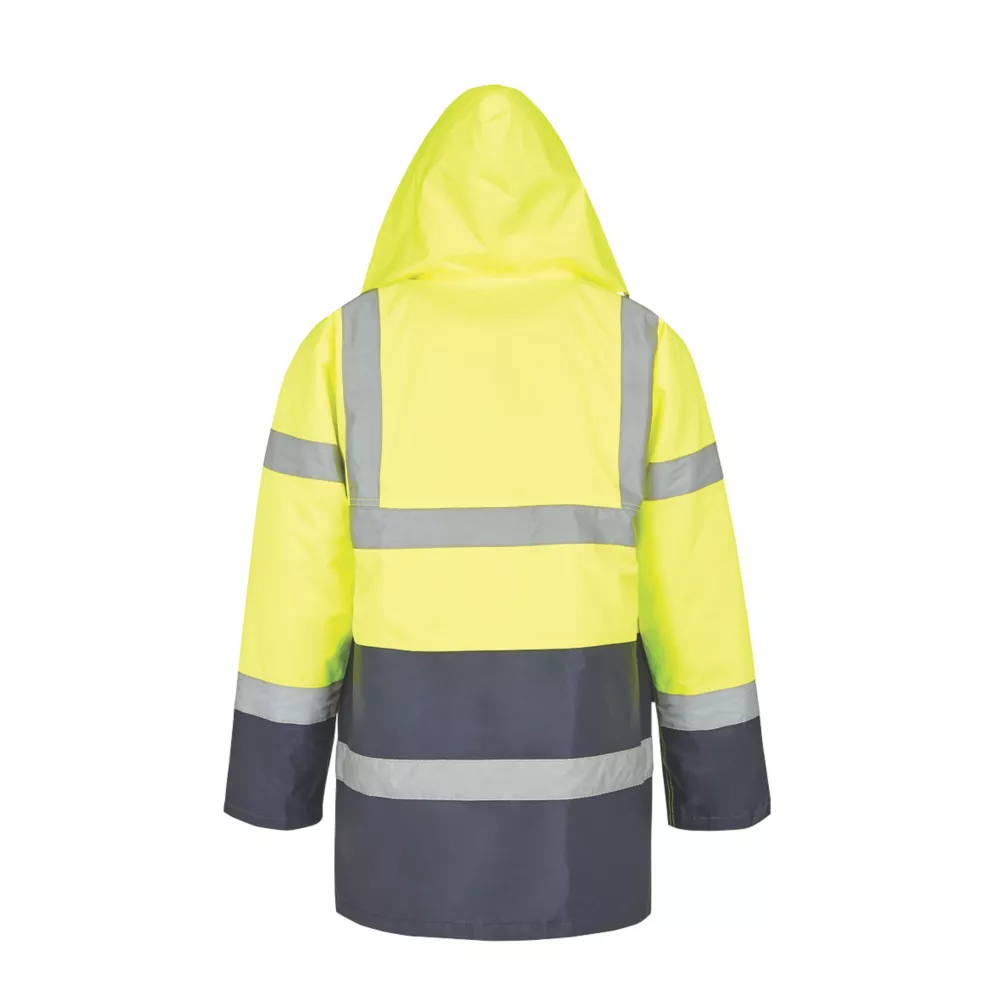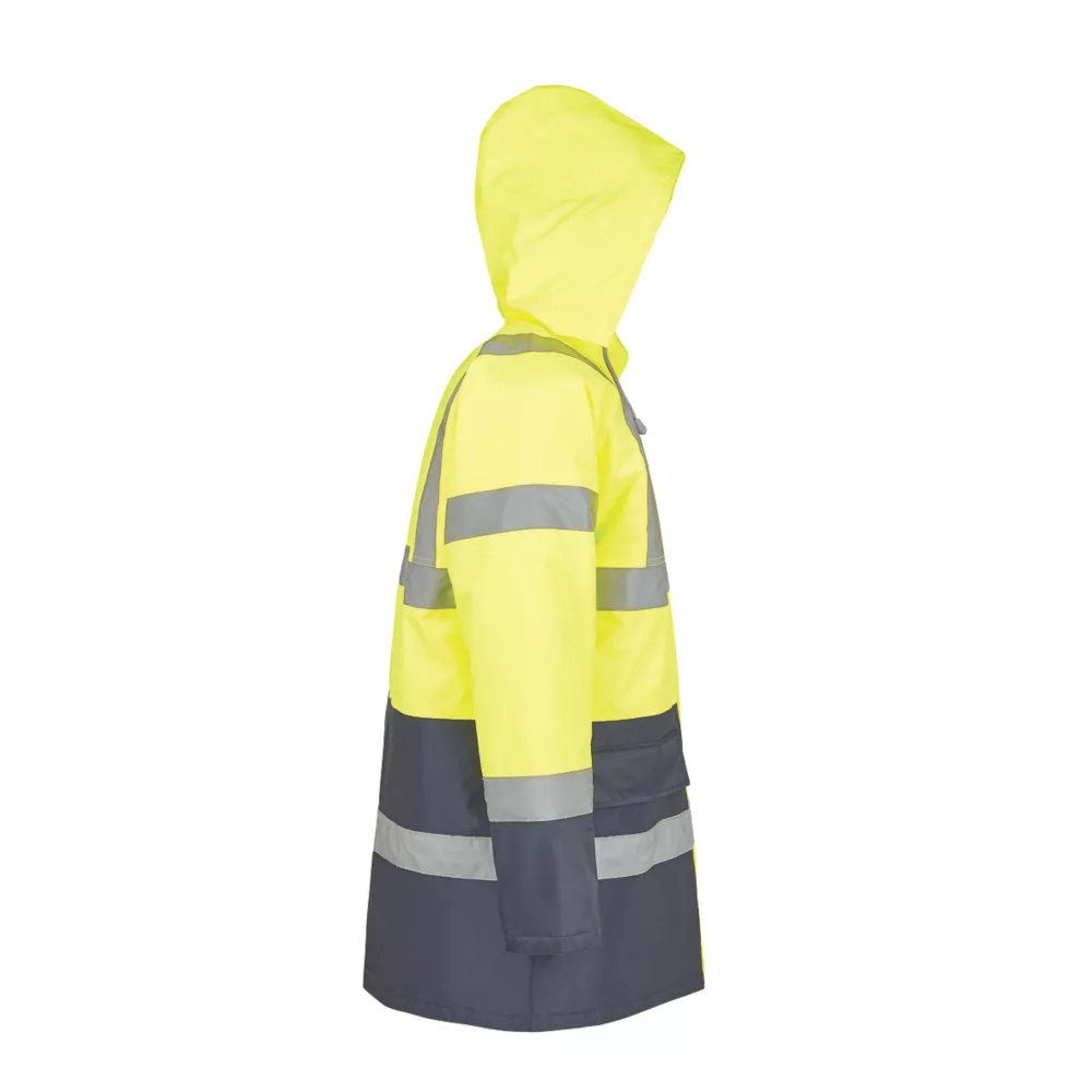 High visibility, waterproof padded traffic jacket with reflective tape. Features storm cuffs and internal zip pocket. 190g/m².